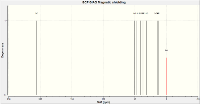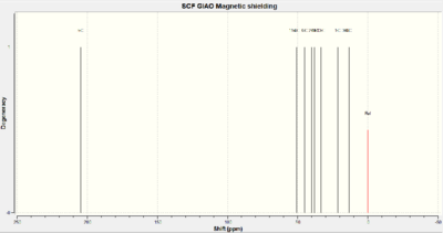 The results were not in very good agreement with that of the literatures but it is generally out of literature by a consistent range of ~10ppm. This error may be attributed to wrong setting in setting the reference for the NMR peaks and the limitations of this calculation method itself. The largest deviation between the literature and the predicted carbon shift corresponds to the carbonyl carbon. This shift is abnormally high due to its high deshielding nature caused by oxygen and its rigid structure. Also, the larger the chemical shift, it is likely to incur a greater inaccuracy in the calculation.