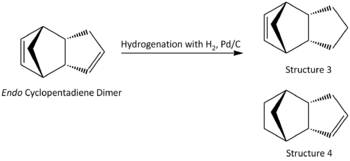 The unsaturated cyclopentadiene dimer can undergo further hydrogenation through H2, Pd/C, with possible attacks on two different sites: the C=C bond in the 5-membered ring or the C=C bond in the norborene ring as shown in Fig. 1.1c.