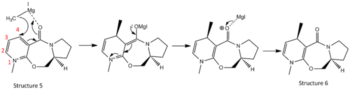 Methylation of pyridine rign can be highly stereo- and regioselective through nucleophilic addition with Grignard reagents. The methyl group is expected to add specifically at the C(4) position of the pyridine ring due to chelate effect from the magnesium and the carbonyl group. Selectivities as high as 99:1 is observed experimentally with bulkier halide substituent such as iodide in the Grignard reagent.[3] From the product shown in structure 6, there are two chiral centres: one at the alkylating centre and one at the hydrogen anti to the alkylated carbon.