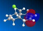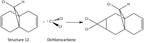 This example investigates the electrophilic addition of dichlorocarbene with structure 12 as shown above. In structure 12, two nucleophilic sites of C=C bond are susceptible to electrophilic addition from potential electrophile such as dichlorocarbene. This electrophilic addition reaction involves a flow of electron density from the nucleophile to the electrophile during bond formation and hence it is interesting to investigate the HOMO-LUMO interaction in this process.