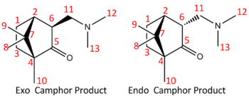 Hine and co-workers first treated 3-(hydroxymethylene)-d-camphor with dimethylamine followed byhydrogenation in the presence of platinum oxide and hydrochloric acid[6]. This results in a very good yield of 90% with 80% exo-isomer and 20% endo isomer. The presence of this diastereomers was proven with NMR results and could be isolated with repeated crystallisation.