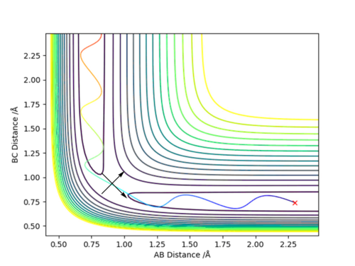 The minimum energy pathway shows that there is no energy stored in the vibrational modes of the BC bond because there is no oscillation of the pathway along the BC axis. Under the dynamic calculation type there is an oscillation of the B-C bond and hence an oscillation along this axis which means that this trajectory does not follow that of the minimum energy pathway. This trajectory is also more accurate of the actual reaction pathway the reaction proceeds by as it is highly unlikely the B-C bond is rigid.