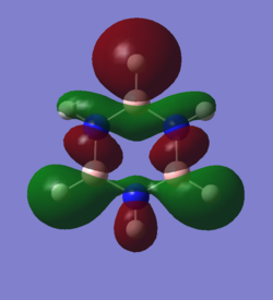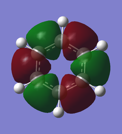The calculated molecular orbital can be interpreted to the same end as the simple aromatic assumptions. These molecular orbitals show that there is a stronger bond than a single bond as the z orbital overlap in an additional pi-bonding orbital and creates a disk shaped structure that interconnects all ring atoms. This also shows that since a completed ring is needed to have this effect, if a new bond would use a z-p orbital, the aromaticity would be broken. It also shows that large electron density is present above and below the plane of the ring.