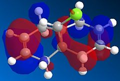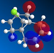 Observation from both the HOMO-1 and HOMO (Fig 1.4.2a and Fig. 1.4.2b) shows that the majority of the electron density are on the syn double bond (along the side to which the Chlorine atom is pointing). On the other hand, in the LUMO (Fig. 1.4.2c) the vast of the elctron cloud is seen to be around the anti double bond, indicating the electron deficient nature of this bond.