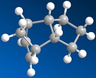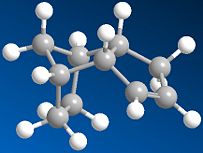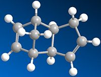 From the MM2 calculation it was apparent that the exo-dimer 1 (Fig. 1.2.2a) is the thermodynamically more preferred product (energy = 31.8852 kcal/mol), compared to its endo-isomer 2(Fig. 1.2.2b)whose energy is notabaly higher (energy = 34.0001 kcal/mol)due to steric hinderance, with the major contribution from the torsional strain between the 5-membered ring and the bridge. However experimentally,the endo product is favoured. Thus it can be deduced that the thermodynamic factor here is overridden by the kinetic one, i.e. the stability achieved from the 'preferred' relative orientation in which the dienenophile attacks the diene; and as proven, the cyclodimerisation of Cyclopentadiene is indeed kinetically controlled.