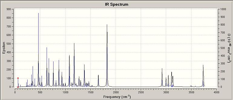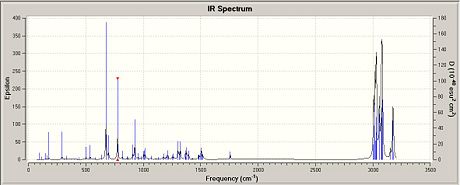 The method used to obtain vibrational data is the DFT (Density Function Theory) B3LYP/6-31G(d,p), following the geometry optimisation procedure as previously used. Gaussian 03 was used to run the geometry opitmisation and frequency calculation via submission on SCAN, as the time it takes to run on the assigned laptop would take much longer. For details of the procedure involved please click HERE.