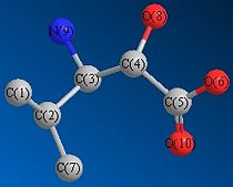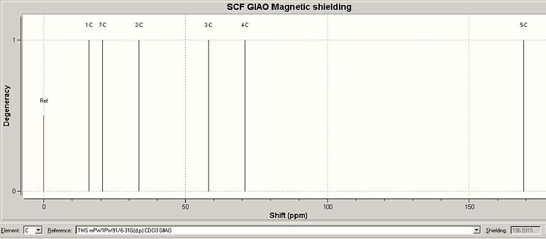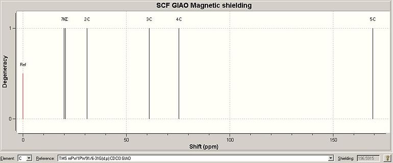 The Gaussian job for NMR calculation was run using the GIAO approach, where DFT-MPW1PW91 optimisation was employed. The carbon atoms are numbered for NMR assignment and is illustrated in Fig. 2.2.1. The solvent was specified in the literature as D2O and therefore in the calculation the solvent was changed to water. The chemical shifts are viewed against CDCl3 reference and displayed in Fig. 2.2.2. Table 1.5.1 summerises the comparison between predicted and reported NMR data. From reading the data, the calculated values are in very good agreement with the literature values.