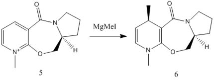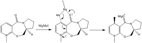 From the geometry study above, the reaction mechanisms for both reactions are deduced and illustrated (Fig. 1.2.2a and Fig. 1.2.2b). For the Grignard reaction, the reactants 5 and 6 follow a chelating mechanism, i.e. the carbonyl is chelated by the the Mg and causes the methyl group to move to the upper side of the pyridinium ring.