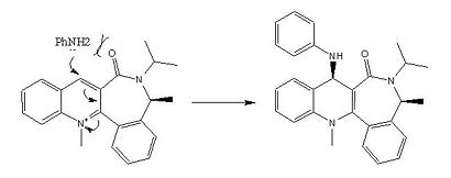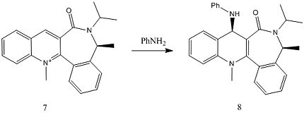 The opposite behaviour is demonstrated in the anilination of 7, where the attacking group approaches the carbonyl in the anti fashion. As mentioned in the introduction previously, the selectivity of this reaction results from the steric repulsion between the carbonyl and the nucleophile leading to attack on the anti face.