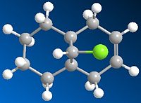 The objective of the second part of this exercise is to investigate and quantify the influence of the Cl-C bond on the vibrational frequencies of this molecule, through comparing between the molecule 12 and its anti monohydrogenated derivative D in which the exo double bond, and 'only' the exo bond is replaced by a C-C single bond (Fig. 1.4.4).