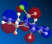 Therefore the more favoured alkene in 12 is the endo alkene, since the HOMO shows an significant amount of electron density across the syn double bond. As mentioned above, it is the electrons from the HOMO that determines the alkene's reactivity, via the donation into the electrophile's LUMO. Further probe into the LUMO of dichlorocarbene (the electrophile) provides insight into the symmetry of this orbital (Fig. 1.2.3) - a symmetry that matches that of the endo alkene HOMO along the plane of the ring (assuming it is also the plane of approach in the reaction).