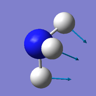 In an experimental spectrum of gaseous ammonia we would expect to see 3 bands corresponding to the bending vibrations at 1090 cm-1 (strong band) and 1694 cm-1 and the stretching vibrations at 3461 cm-1 (weak band). Degenerate vibrations will not be observable since they are equal in energy and will therefore not be seen on the spectrum. The strecthing vibrations at 3590 cm-1 have a too weak intensity to be seen on the spectrum.