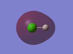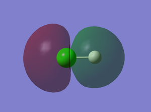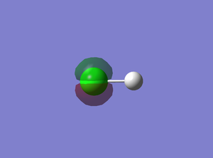 This is a bonding molecular orbital derived from 1s AO of H and 3pz AO of Cl. The two AOs overlap in phase to form this sigma orbital. It is occupied by two electrons and there is one node on the Cl atom.