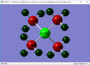 According to two tables above, it can be seen that the charge on H atom in both of the cation is similar. However, there is a huge difference in change on C atom and central atom. For the [N(CH3)4]+ ,the central atom is N and the charge on it is -0.295, while the central atom P in [P(CH3)4]+ has a positive charge (+1.666). This may due to their electronegativities shown in table above. The electronegativity for N is bigger than C while P has a smaller electronegativity than C. P is in the third row of the periodic table, it is larger and more polarisable than N which is in the 2nd row.