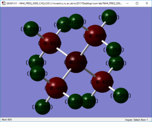 Low frequencies --- -19.8898 -19.6985 -17.8980 -0.0005 -0.0004 -0.0001 Low frequencies --- 101.7538 102.1821 154.5874 Diagonal vibrational polarizability: 3.9894533 7.0946637 9.3153185 Harmonic frequencies (cm**-1), IR intensities (KM/Mole), Raman scattering activities (A**4/AMU), depolarization ratios for plane and unpolarized incident light, reduced masses (AMU), force constants (mDyne/A), and normal coordinates: 1 2 3 A' A" A' Frequencies -- 101.7534 102.1765 154.5866 Red. masses -- 110.8405 111.9304 98.9616 Frc consts -- 0.6762 0.6885 1.3934 IR Inten -- 0.6204 0.6941 1.3560 Atom AN X Y Z X Y Z X Y Z 1 7 0.20 -0.32 0.00 0.00 0.00 -0.36 -0.42 -0.27 0.00 2 53 0.28 -0.44 0.00 0.00 0.00 0.55 -0.26 0.43 0.00 3 53 -0.15 0.24 0.46 -0.26 0.39 -0.26 0.15 -0.20 0.44 4 53 -0.15 0.24 -0.46 0.26 -0.39 -0.26 0.15 -0.20 -0.44