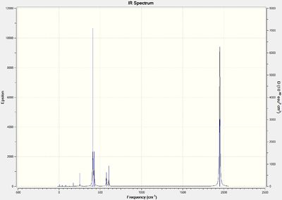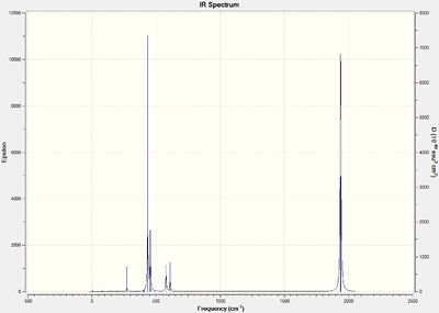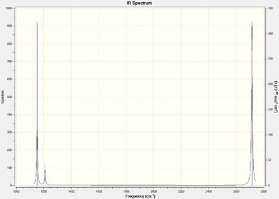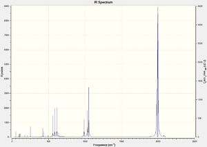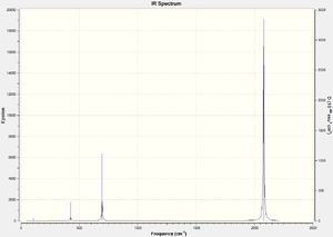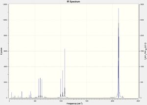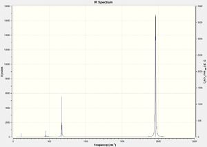 Although six vibrational modes are described, it must be noted that the symmetric stretching does not involve a dipole change; it therefore does not show up on the IR spectrum. Also, the 1209.64 and 2714.67 peaks are degenerate due to their E' symmetry, thus giving a total of three peaks, as shown in the predicted IR spectrum.
