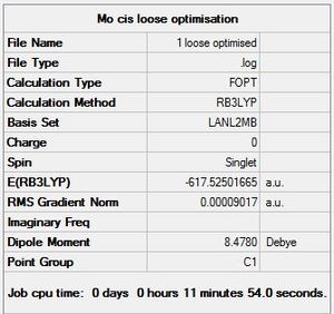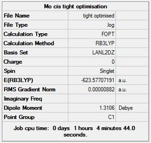 The LANL2MB basis set was used, which is the smallest of the 3 employed, making this optimisation the loosest one. Nevertheless, convergence is confirmed to have occurred, with a sufficiently low RMS Gradient norm value at the end of 12 optimisation iterations for cis, and 8 for trans.