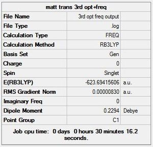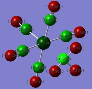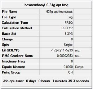 For B3LYP/6-31G, 11 steps were needed before complete optimisation, while 13 were needed for the GEN method using 6-311G(d,p) & LANL2DZ basis sets. As expected, the GEN method which incorporates the larger basis set LANL2DZ and 6-311G(d,p) took a longer time for optimisation to complete. An immediately apparent difference to Cr(CO)6 is the presence of its dipole moment, as it is no longer octahedral, and instead has C1 symmetry.