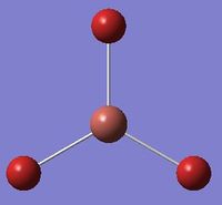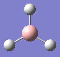 Gaussview was used to create a molecule of BH3, with each B-H bond length custom set to 1.5 angstroms. Its structure was optimised with the B3LYP method and 3-21G set. Although the 3-21G basis set has a low accuracy, for the purposes of a simple molecule such as BH3 it is sufficiently accurate, and saves on computation time.
