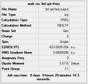 A tighter optimisation was run on the already loosely optimised structure from above, this time using the larger LANL2DZ basis set. Again, there is confirmation of convergence from a low RMS gradient norm value, with the energy minima reached by optimisation iteration 7 for cis, and 9 for trans. An important point to note is that computation time using this method was longer than that of the loose optimisation with the smaller LANL2MB basis set, reflecting the trade-off between accuracy and computation time. One indication that this optimisation has achieved a globally lower minima is the lower Dipole moment of the cis- isomer: 1.31D down from 8.48D.