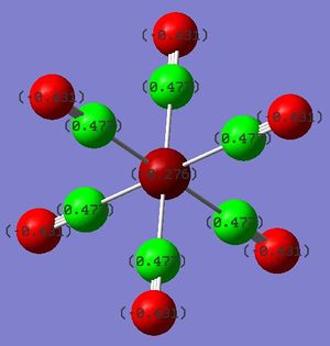 Similar to CrCO6, there was very good agreement between literature values and those obtained through 6-311G(d,p) and LanL2DZ optimisation. The corroboration of this case strengthens the support for this method as an accurate means to model first row transition metal complexes. The only anomaly is in the predicted Cr-C (axial C(OCH3)CH3), which is higher than expected and actually deviates more than the value obtained through 6-31G optimisation. A further point to note is that despite being depicted as a Cr=C bond (i.e. a carbene), both the computed and literature values were greater than the Cr-C single bonds in CrCO6.