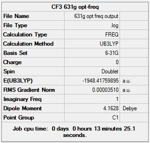 As shown, negative values for low frequencies were found - however, since they lie between values of -10 to 0 cm-1, it is within acceptable range. If negative values of over -10 were found though, it would be an indication that optimisation had not been conducted successfully, as that indicates a significant movement of the atom about its centre of mass, a factor which should not contribute to its vibrational spectra.