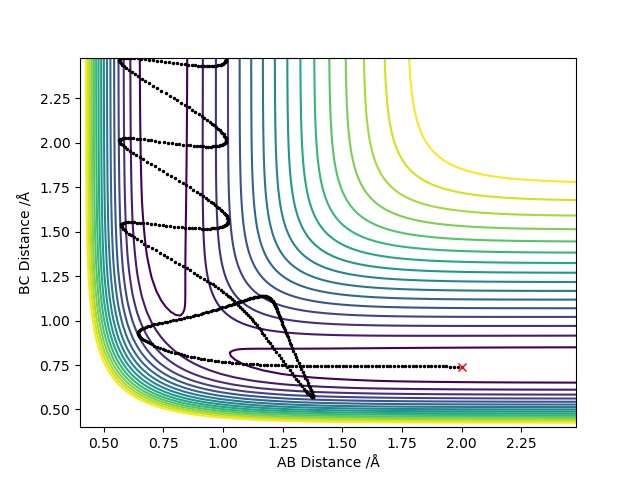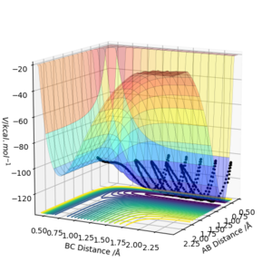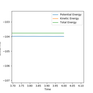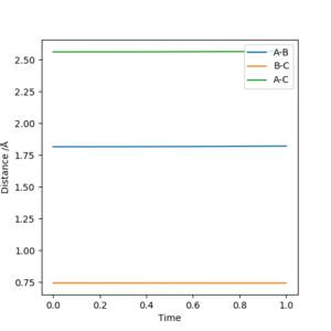 Starting with r(AB) = r(BC) = 0.74 Å, p1 = p2 = 0.0, after varying the internuclear distance, the transition state was observed where the internuclear distance equal to 0.9078 Å. At this distance, no oscillation is observed on the plot shown in Figure.1.