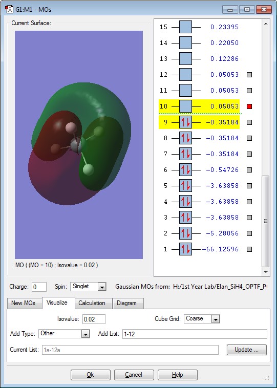 This is the π* Antibonding Molecular orbital between the 3p orbital of the Si and the 1s of the H. The energy of this Antibonding Molecular Orbital is +0.5053. There are 3 degenerate energies for this Antibonding Molecular Orbital. This orbital is unoccupied. This Molecular orbital would be the LUMO of the Molecule, if electrons were to occupy the orbital the molecule would start to destabilize.