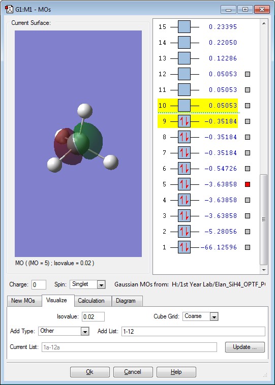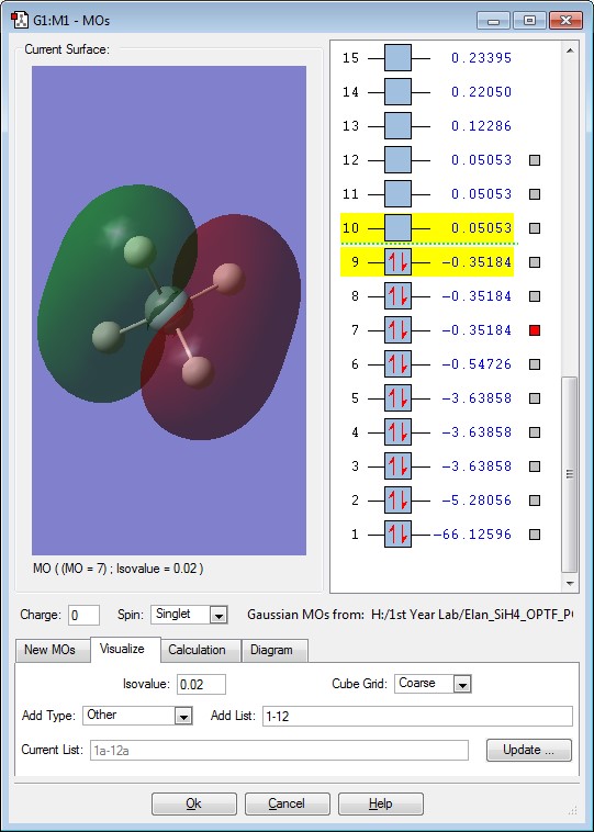 This is the σ interaction between the 3s orbital of the Si and 1s of the H. The energy of this Molecular Orbital is -0.54726. This orbital is occupied by 2 electrons.