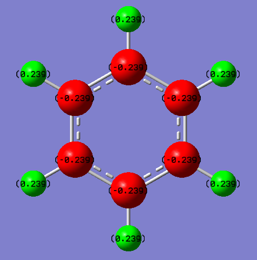 The charges on all the B atoms are evenly distributed and also the same as all the N atoms. But it is not even between B and N atoms, because N is more electronegative (3.0) which attracts more electron density. Therefore N has a negative charge (-1.102 a.u.0) but B has a positive charge (+0.747). And not the H on the borazine has the same charge due to the atoms they are bonded to. Those bonding to B has a very slight negative charge (-0.077 a.u.). And the hydrogens bonding to N has strong positive charge (+0.432 a.u.)