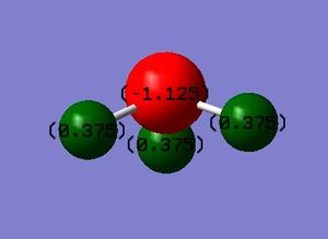 It is expected for the Nitrogen atom (red) to be negatively charged as it is more electronegative than the Hydrogen and it would attract the bonding electrons towards it more than the Hydrogen atoms (green) would, making the hydrogen atoms carry a slightly positive charge. The charge distribution on the Nitrogen atom is -1.125 and +0.375 on each Hydrogen molecule.