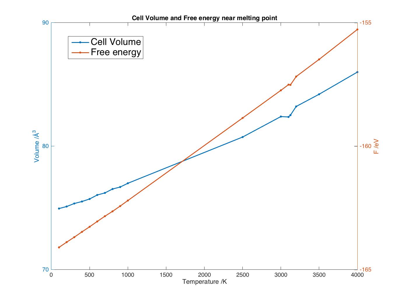 Cell volume and free energy against temperature [100K, 4000K] for MgO (2x2x2 supercell). Calculated using molecular dynamics.