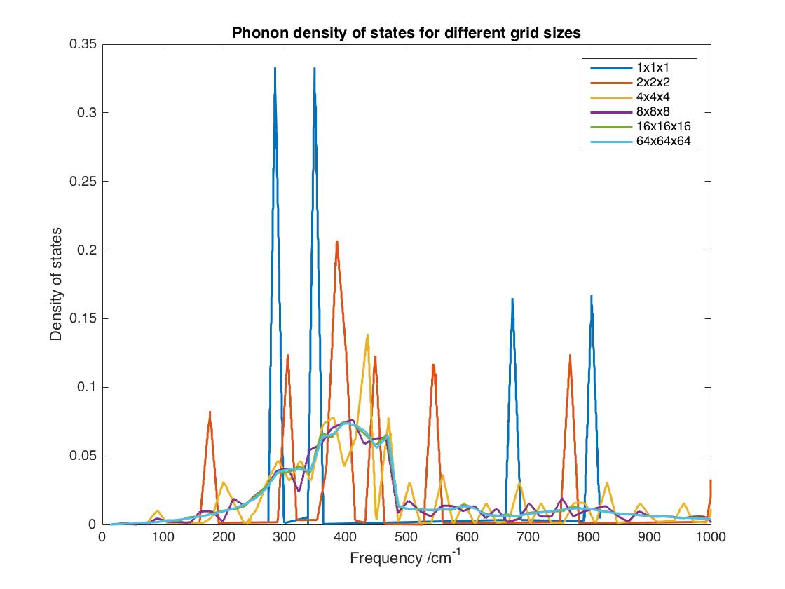 Phonon DOS for different grid sizes. Data saved as PostScript by program in lab. x,y coordinates extracted using GetData Graph Digitizer 2.26 (can be downloaded at http://www.getdata-graph-digitizer.com/download.php) and plotted using MATLAB R2015b.