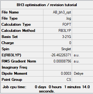 Summary table of the final optimised BH3 molecule used to carry out frequency analysis.