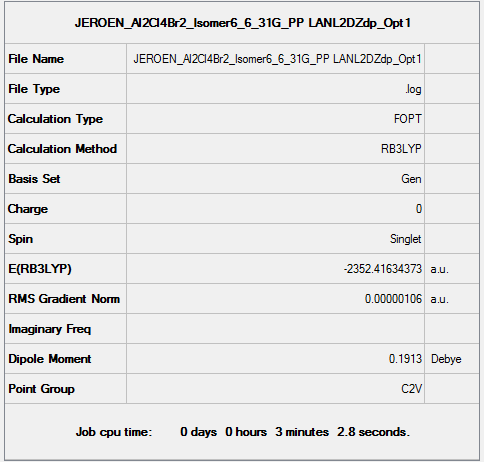 JEROEN_Al2Cl4Br2_Isomer6_6_31G_PP_LANL2DZdp_Opt1_Summary.PNG (484 × 451 pixels, file size: 13 KB, MIME type: image/png)