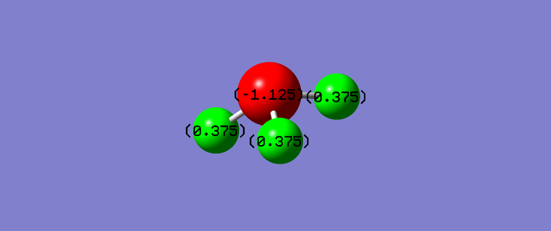 Charge distribution viewed on Gaussian View of the NH3 molecule.