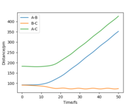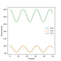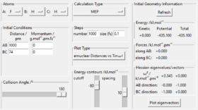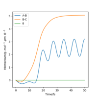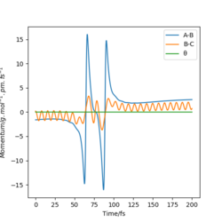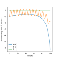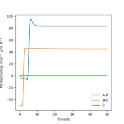 From Table 3. above, MEP ignores the vibrations of the product. In this case, the stretching of H2 molecule is ignored, indicated by the smooth line in "Internuclear Distances vs Time" plot Good. Pu12 (talk) 21:40, 11 June 2020 (BST) . The zero momenta of B-C is also the result of non-stretching. The other thing that is different is the time for complete reaction. It takes about 8 fs in MEP, while 18fs is required in Dynamics.