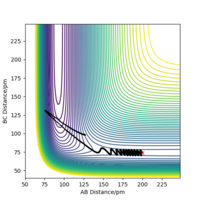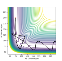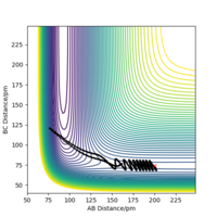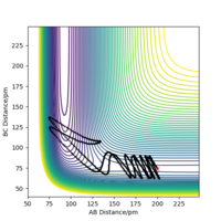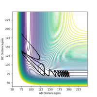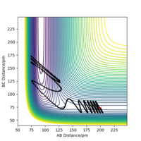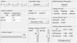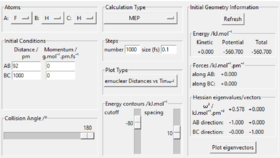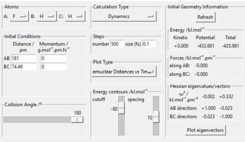 Hammond's postulate is used in the process. Since H+HF reaction is endothermic, the structure of transition state should resemble product H2. Similar to what was done to find the transition state of H-H-H, momenta were set to 0, length BC was set to 74 pm. By adjusting length AB and make minor changes to BC, transition state bond lengths F-H is found to be 181 pm, and that of H-H is 74.49 pm. By looking at "forces" section in Fig 4., both values give " 0 ", indicating that the transition state is reached.