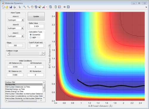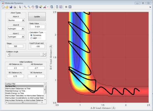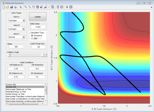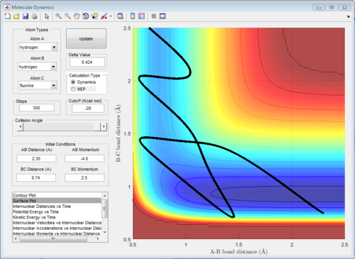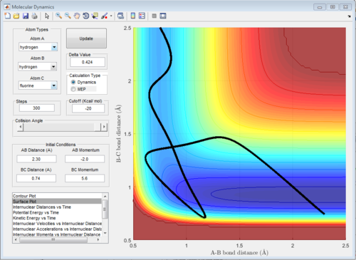 The potential surface diagrams under dynamic method and under MEP method are showed in Fig2. and Fig 3. Comparing those two graphs, MEP method gave a smooth line because MEP method did not consider the realistic motion of molecules (vibration of molecule) and follow the lowest pathway. However, dynamic method considered the vibration of molecule. Hence the line would be fluctuating and do not follow the lowest energy path.