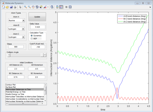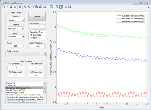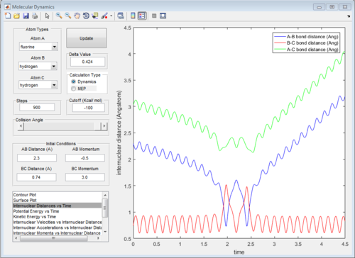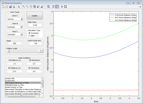At beginning, the changes of kinetic and potential energies are small because it is only due to the vibration of H2 molecule. The potential energy decreases significantly when F atom is close to H2 molecule. The increasing of potential energy at 1.5 s also support the mechanism discussed above. That means F atom move back a little bit.