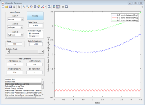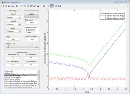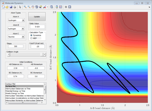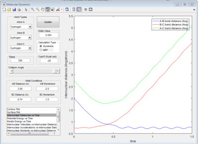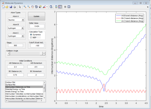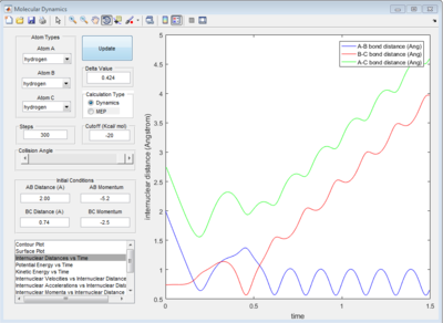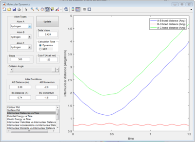 A triatomic system, which is made up of a single atom A and a diatomic molecule B-C, is investigated in order to understand the molecular reaction dynamics. The reaction between an atom A and a molecule B-C will only happen under certain condition. The reaction trajectory is tested by MATLAB program. Setting different initial distances and momenta of A-B and B-C would give different reaction trajectories which indicate the reactivity of collision. Based on the reaction trajectory, transition state and activation barrier could be found. The energy applied (momentum) must be greater than the activation barrier to promote reaction. However, this is not enough for reaction. Based on energetics of reaction, vibrational or translational energy is more efficient to promote the reaction.