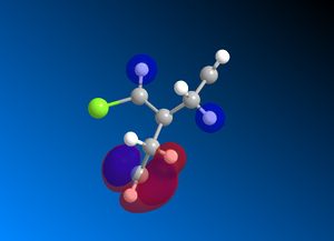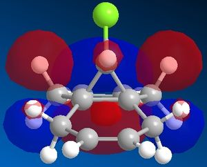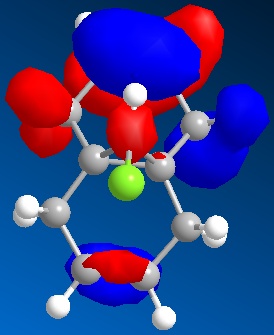 The reaction of reactant molecule 1 with dichlorocarbene is similar to electrophilic attack by the dichlorocarbene molecule on the HOMO so by studying the image created via the MOPAC interface of the HOMO we can see that there is a greater amount of electron density located around the C=C double bond that is syn to the C-Cl bond and hence this is where the reactant molecule will be attacked by the electrophilic dichlorocarbene.