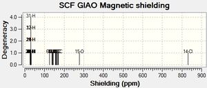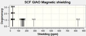 The literature values ranged between 22.0 to 72.0ppm for the cis-isomer and 21.4 to 73.8ppm for the trans-isomer. Clearly there has been some sort of error whilst calculating the NMR shifts as my results range between 127.048 to 169.083ppm for the cis isomer and 126.329 to 169.886ppm for the trans isomer which is approximately 100ppm away for both isomers(very far out). Although this is the case, the results for the 2 isomers can be compared to each other and the shifts of the carbon atoms in the same molecule are, to some extent, also comparable i.e. the carbon atoms bonded to the electronegative oxygen and chlorine atoms are the most deshielded in the spectrum.