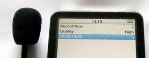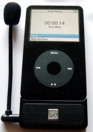 iPod and MicromemoVoice MemosYou will need a voice recorder. The easiest route I have found is to use a Video iPod, equipped with a suitable recorder. The MicroMemo from Xtreme Accessories docks with the iPod, and has a small attached microphone. The entire assembly can fit into e.g. a shirt pocket. A Separate lapel or tie microphone can also be attached.