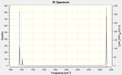 There are fewer vibrational peaks than there are vibrations as not all vibrations are IR active, e.g. at 2582 cm-1. In addition, there are two pairs of vibrations that occur at the same wavenumber and hence overlap (at 2716 cm-1 and 1213 cm-1). As a result, there are three peaks in the spectrum even though there are six vibrations.