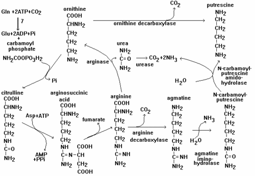 Nicotine is synthesized from a protein chain called polyamine putrescine at the root of tabacco plant. The nicotine would then be transferred to the shoot of the plant and stored. Polyamine putrescine can be synthesised from ornithine with a presence of ornithine decarboxylate as a catalyst. On this pathway, CO2 is produced as a by-product. Another pathway is to react arginine in a presence of arginine dacarboxylate as a catalyst via forming agmatine. This pathway has three stages of reaction in order to get a desired product. The pathway is shown below.