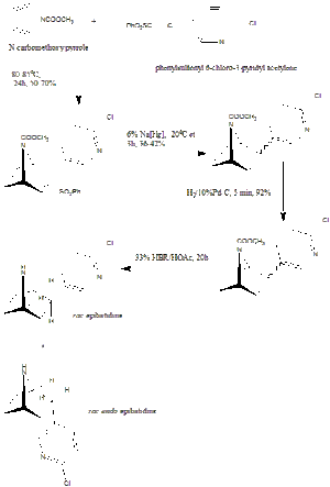 The first step involves a Diels-Alder reaction involving the two starting materials: N-carbomethoxypyrrole and phenylsulfonyl 6-chloro-3-pyridyl acetylene. The two unwanted double bonds were then reduced by first sodium amalgam and then a Platinum catalyst and hydrogen. The final step involves the removal of the N-carbomethoxy protecting group to reveal the desired product.