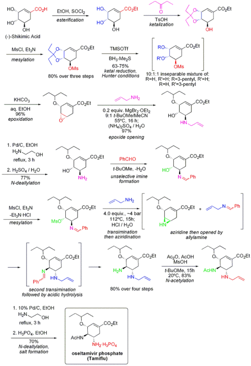 The synthesis of Tamiflu uses shikimic acid which is extracted from the pods of star anise. The commercial synthesis of Tamiflu uses a complex 10 step synthesis with some steps using explosive azide. This limits the speed at which synthesis may be carried out. The process is extremely long, approximately 6-8 months to complete. To make things worse, 30kg of star anise only produces 1kg of shikimic acid. Hence, in order to be able to produce the quantities of Tamiflu required to fight a flu pandemic, either another source of shikimic acid must be found or another synthesis devised.