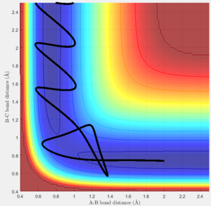 This wiki page introduce a method to find the how the translational energy and vibrational energy affect the reaction trajectory in order to give the best combination for starting a reaction. The reaction trajectory are calculated and modelled by MATLAB. Two triatomic reactions are going to be discussed.