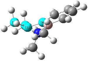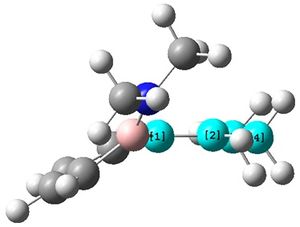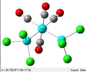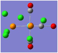 The molecule was now ready for an optimisation calculation. The method used was DFT/B3LYP, the basis set was LanL2DZ (which is a medium level basis set: D95V on first row atoms and Los Alamos ECP ie. pseudo potentials on the heavier elements).